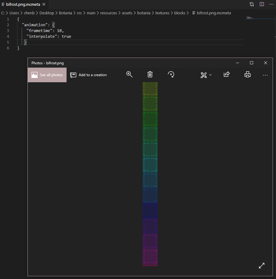 关于动态材质相信读者都不会太陌生,因为模组的模型加载说到底还是跟随了原版的机制,所以我们固然可以想到动态资源包中常用的 mcmeta 格式以及瀑布般的长条材质,其实 Minecraft 中重复简单的方块动画都可以用 mcmeta 配合一个包含动画过程关键帧的图片格式轻松实现,其实彩虹桥方块的动画也是这样的,在 Botania 的 resources 目录中我们可以找到 bifrost.json, 这就是彩虹桥方块的模型